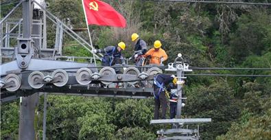 一面鮮紅的黨旗迎風(fēng)飄揚(yáng)在大理州企業(yè)家協(xié)會副會長單位——大理旅游集團(tuán)下屬的賓川雞足山索道34米高的支架上,旁邊五六個檢修師傅正在認(rèn)真細(xì)心地進(jìn)行著索道更換支架輪襯及潤滑保養(yǎng)工作……“我們每天從中午12點開始停運(yùn)索道,一直到晚上23:30,對索道全面進(jìn)行檢查維護(hù)。雖然我們工作這么長時間,但是為了游客的安全,再辛苦我們都覺得是很高興、很榮幸的一件事情?!?雞足山旅游公司索道經(jīng)營部電器組組長 李云龍說。在集中開展景區(qū)節(jié)前索道、景區(qū)旅游專線客運(yùn)車、景區(qū)道路大保養(yǎng)、大排查、大檢查工作中,為確保節(jié)前“體檢”工作按質(zhì)按量順