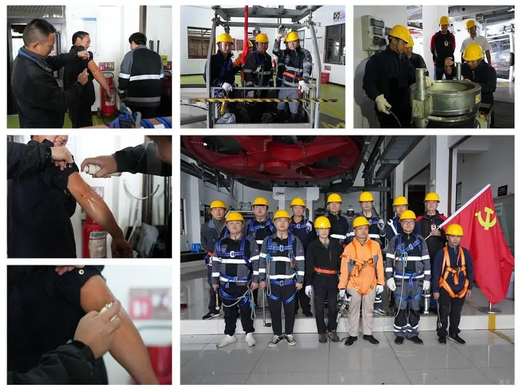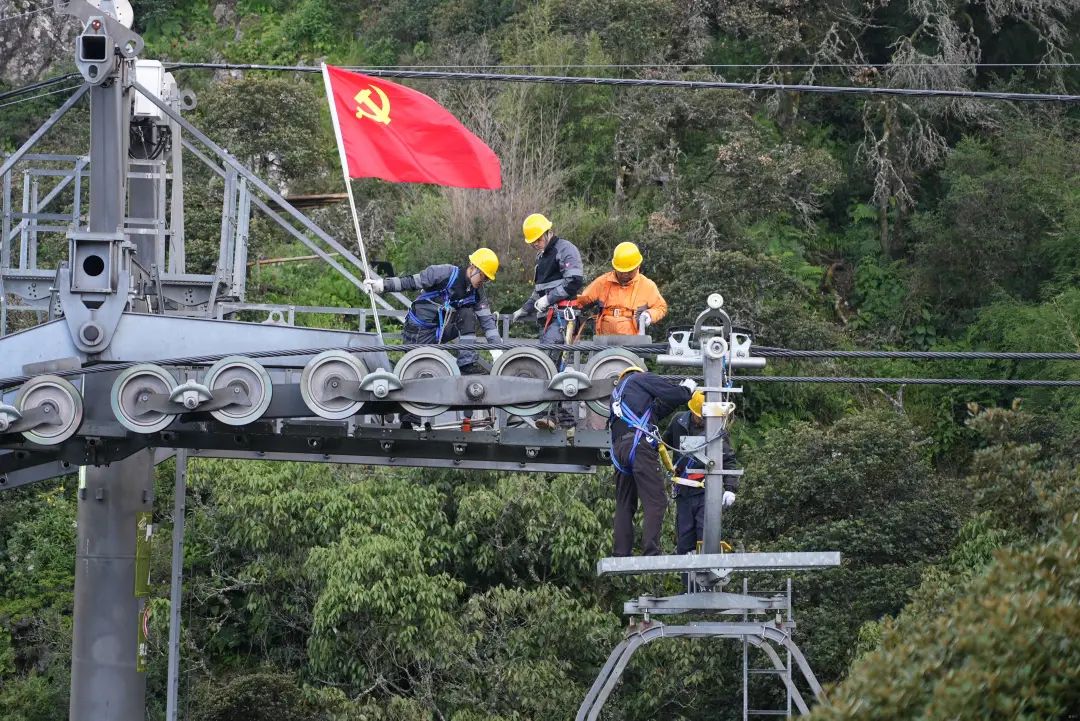 一面鮮紅的黨旗迎風飄揚在大理州企業(yè)家協(xié)會副會長單位——大理旅游集團下屬的賓川雞足山索道34米高的支架上,旁邊五六個檢修師傅正在認真細心地進行著索道更換支架輪襯及潤滑保養(yǎng)工作……