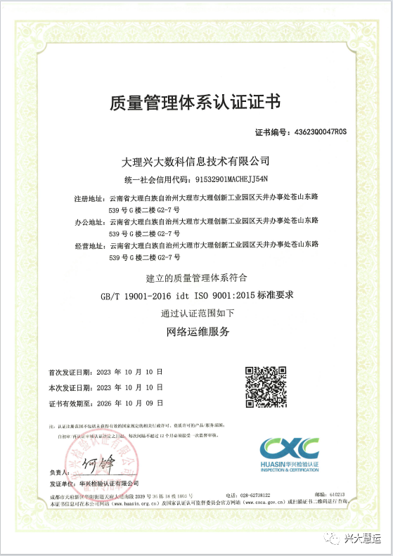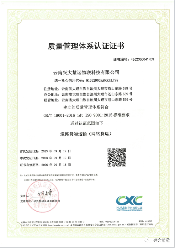 興大慧運(yùn)通過ISO9001質(zhì)量管理體系認(rèn)證