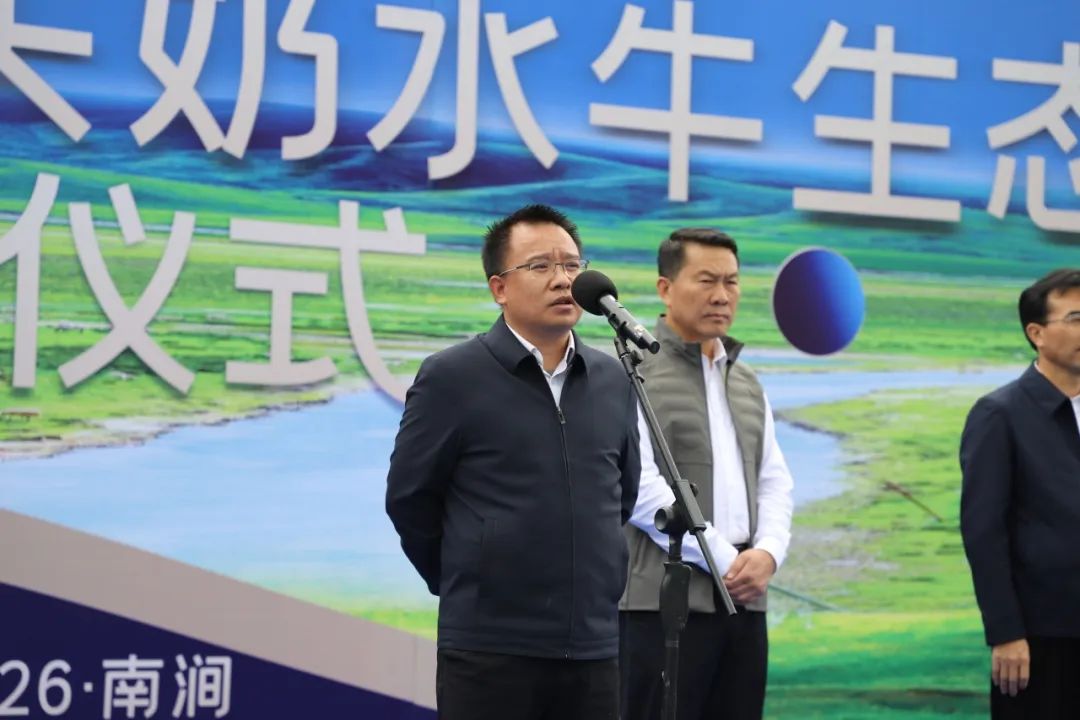 為認真貫徹落實省、州黨委、政府加快推進大理乳業(yè)高質(zhì)量發(fā)展的決策部署,10月26日上午,全球高海拔地區(qū)規(guī)模最大,也是大理州“8+1”萬頭牧場建設項目中唯一一個奶水牛場,由大理州企業(yè)家協(xié)會理事單位——來思爾乳業(yè)投資建設的大理來思爾摩菲水牛云端牧場建成暨進牛儀式在大理州南澗縣擁翠鄉(xiāng)隆重舉行。中共大理州委副書記肖創(chuàng)勇,州人大常委會副主任字云飛,州政府黨組成員、一級巡視員吉向陽,各州級相關單位和各縣相關領導出席了儀式。來思爾乳業(yè)總經(jīng)理馬萬平出席了儀式并作表態(tài)發(fā)言。