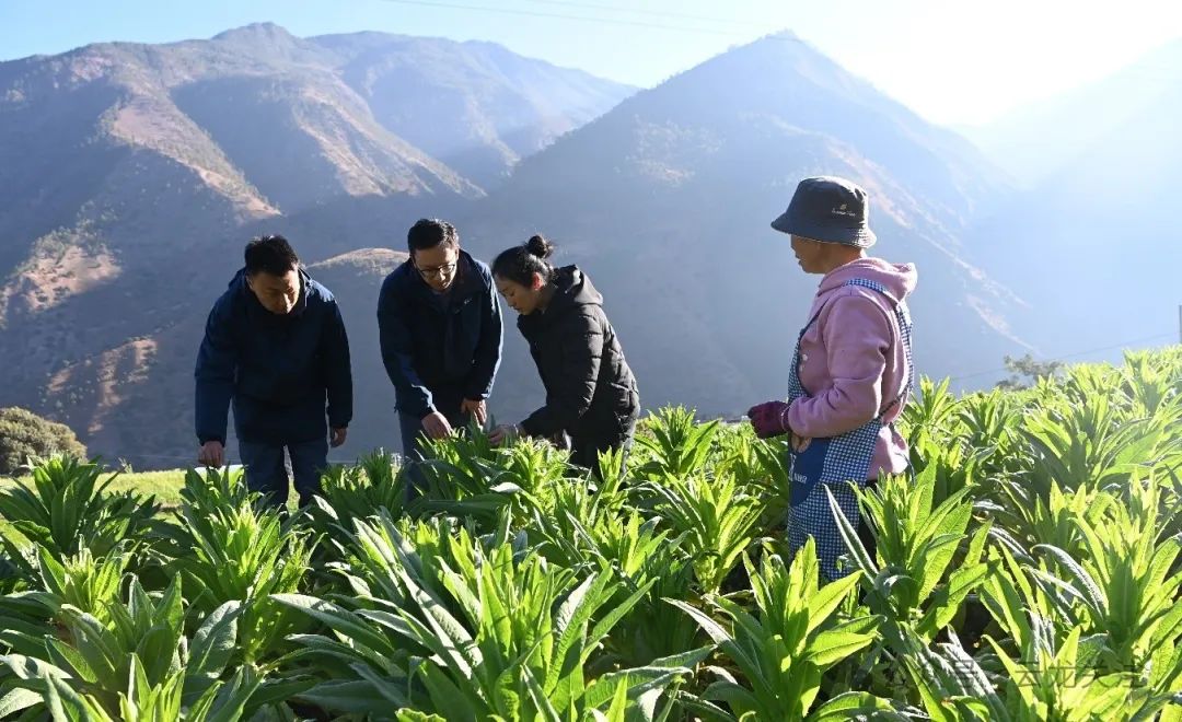 駐村工作隊與村民探討貢菜種植。陶華 攝