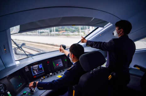 列車司機(jī)駕駛復(fù)興號(hào)列車行駛在中老鐵路上。