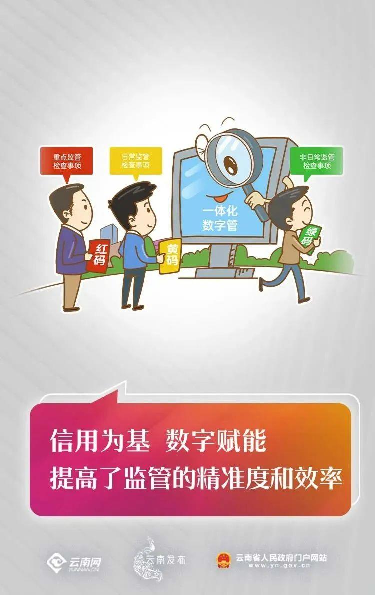 將涉及人民群眾生命健康安全的食品、藥品、特種設備等重點領域的監(jiān)管檢查事項標記為“紅碼”,嚴格加強監(jiān)管守好安全底線;除“紅碼”事項外,其他所有需要主動發(fā)起的日常監(jiān)管檢查事項標記為“黃碼”,原則上均轉為隨機抽查方式開展;將沒有設定日常主動檢查,及3年監(jiān)管秩序合規(guī)情況良好等監(jiān)管檢查事項標記為“綠碼”,除舉報投訴外一般不再主動發(fā)起日常檢查。監(jiān)管突出信用約束,全面運用數字化信用評價結果,以信用監(jiān)管、風險評估數據為依據,決定“做什么、查什么、怎么查”。