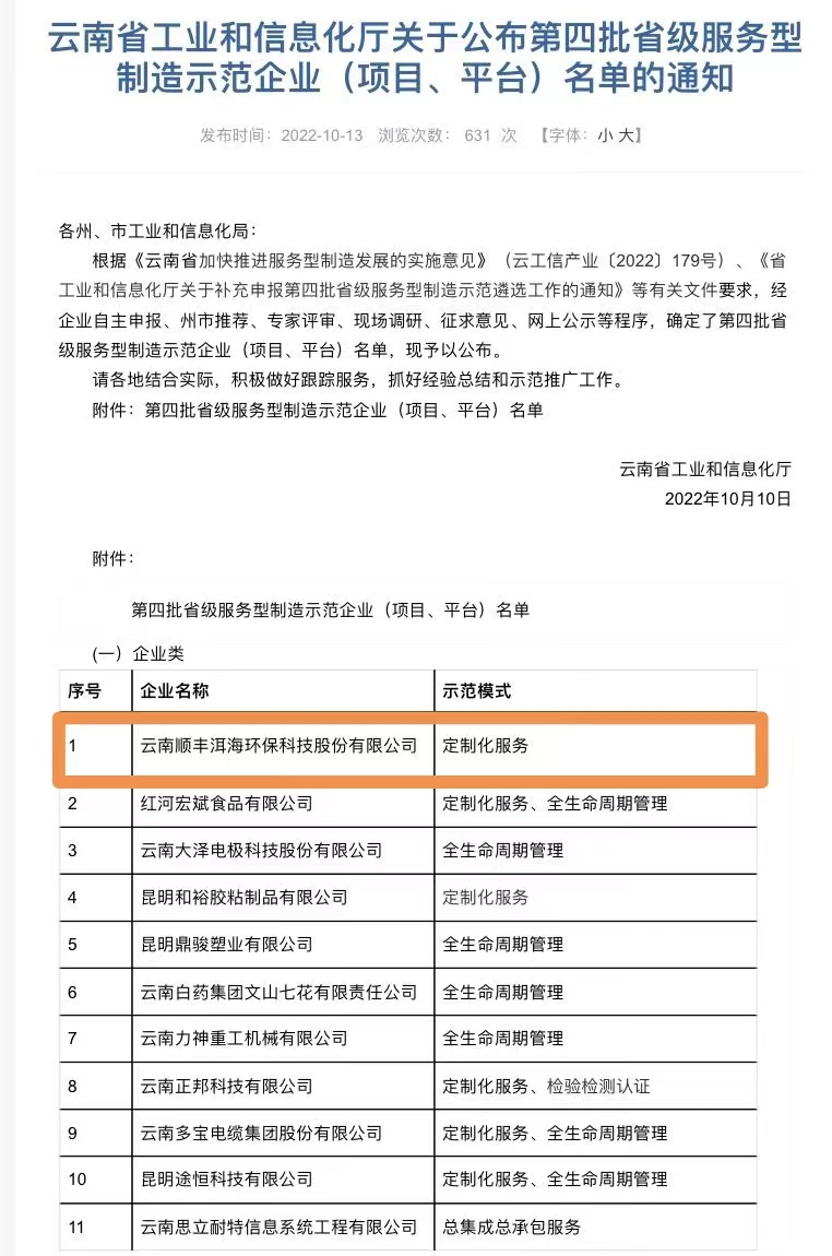 云南順豐洱海環(huán)保科技股份有限公司被確定為云南省服務(wù)型制造示范企業(yè)