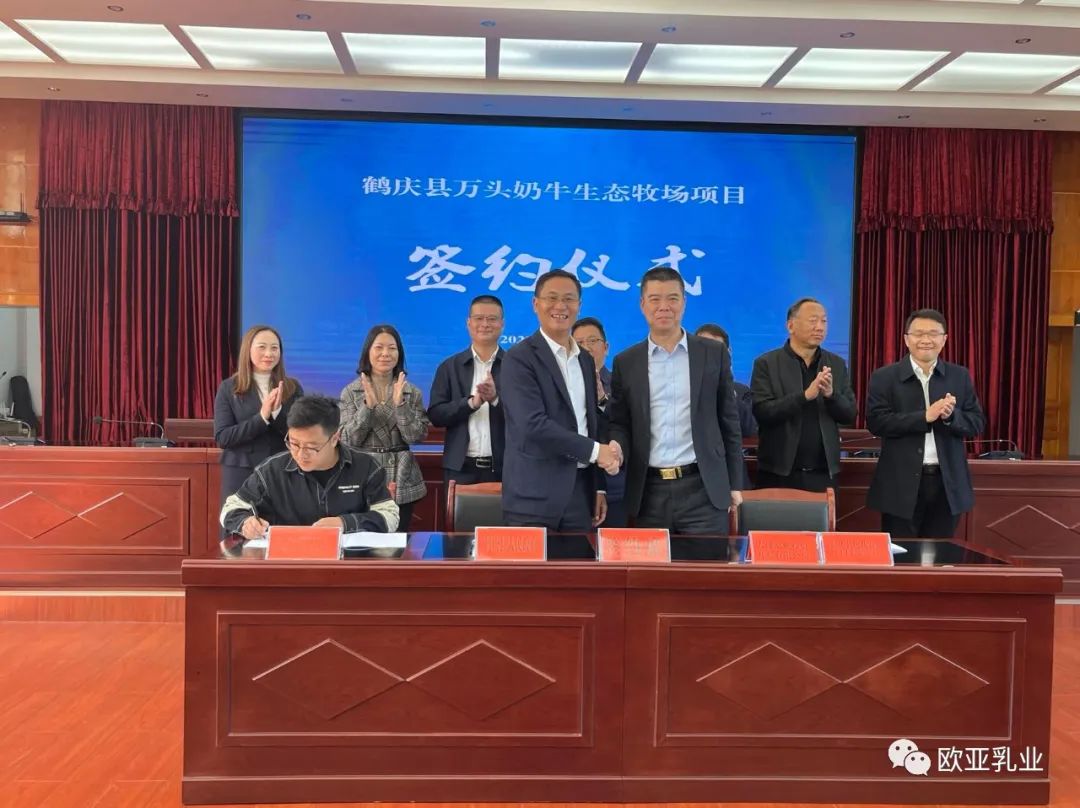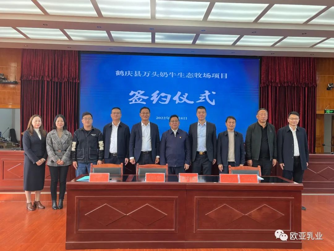 為加快綠色奶源基地建設(shè),提高優(yōu)質(zhì)原料奶供應(yīng)量,大理州企業(yè)家協(xié)會理事單位——云南歐亞乳業(yè)有限公司繼2015年在鶴慶縣金墩鄉(xiāng)北溪村投資建設(shè)萬頭國家級奶牛標(biāo)準(zhǔn)化示范場后,11月8日,又與鶴慶縣政府簽定投資協(xié)議,新建一個存欄11000頭娟姍奶牛的有機(jī)生態(tài)牧場。大理州政府黨組成員、一級巡視員吉向陽,鶴慶縣四班子領(lǐng)導(dǎo),縣級相關(guān)部門負(fù)責(zé)人等領(lǐng)導(dǎo)出席儀式,歐亞乳業(yè)公司董事長彭金國及管理人員參加儀式。