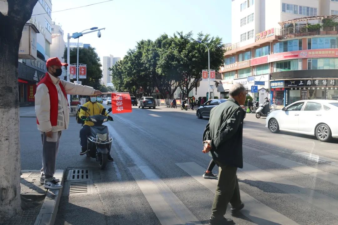 在下關(guān)城區(qū)重點(diǎn)路段都能看到志愿者們的身影,他們身穿紅色馬甲,頭戴志愿帽,手持“文明勸導(dǎo)”交通指揮旗,從早上7點(diǎn)到下午7點(diǎn),在凜冽寒風(fēng)與灼灼烈日下堅(jiān)守在文明勸導(dǎo)崗位上,協(xié)助交警維持交通秩序,勸導(dǎo)行人在人行道內(nèi)行走,不闖紅燈、不隨意橫過道路,不翻越隔離護(hù)欄等,營造了安全暢通的交通環(huán)境。