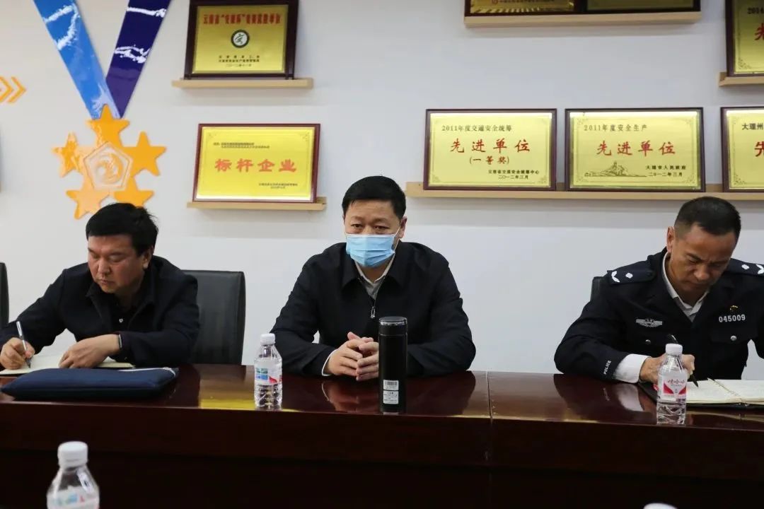 為進(jìn)一步做好全國“兩會”期間安全維穩(wěn)工作,云南省交警總隊(duì)周鉍祿總隊(duì)長在大理州交警支隊(duì)長張嘉杰以及行業(yè)管理部門相關(guān)領(lǐng)導(dǎo)的陪同下,到大理州企業(yè)家協(xié)會常務(wù)副會長單位——大理交通運(yùn)輸集團(tuán)公司對安全生產(chǎn)工作進(jìn)行調(diào)研指導(dǎo)。