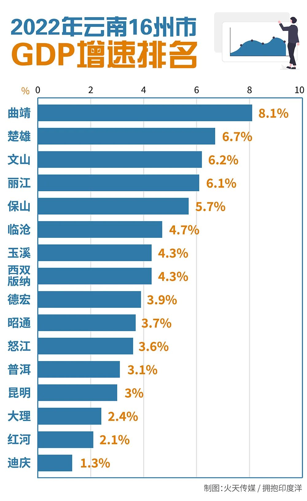 2022年,云南實(shí)現(xiàn)地區(qū)生產(chǎn)總值28954.20億元,比2021年增長4.3%,超過全國增速1.3個(gè)百分點(diǎn),排名第六,與第一名的福建、江西僅差0.4個(gè)百分點(diǎn)。
