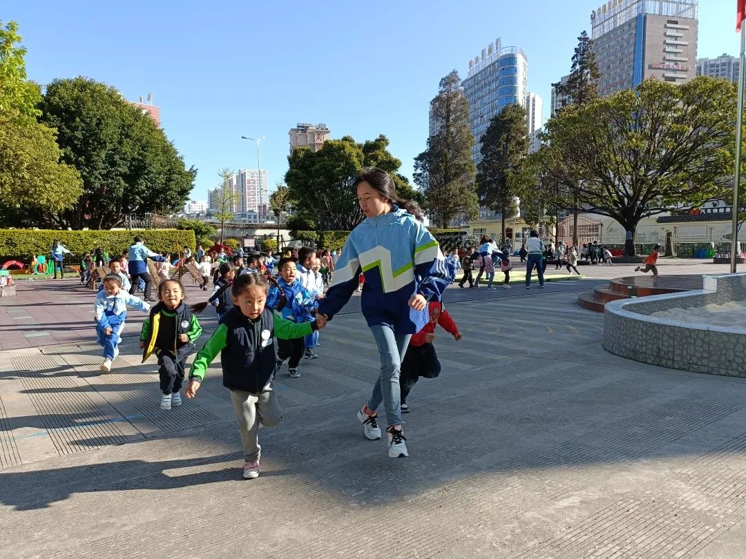 戶外活動(dòng)的幼兒由教師組織迅速撤離操場,往教室方向跑。