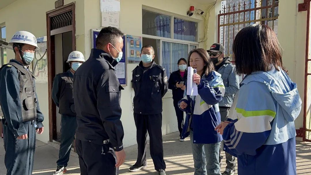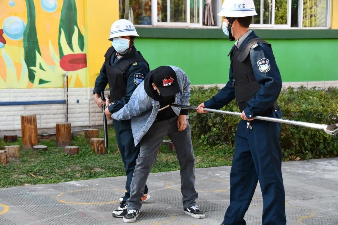 在保安員詢問情況登記相關(guān)信息時(shí),“歹徒”突然拿出兇器,意圖強(qiáng)行闖入幼兒園。