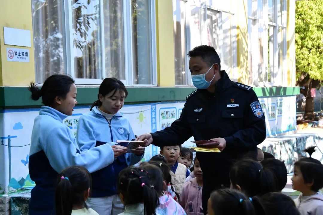 民警叔叔給小朋友講解防恐的知識(shí)。