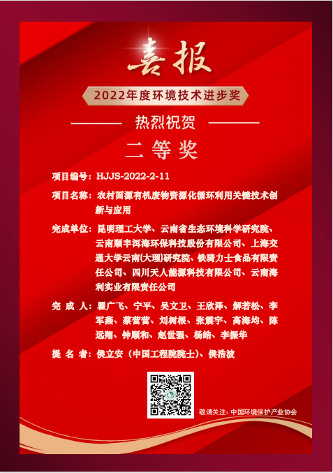 云南順豐洱海環(huán)保農(nóng)村面源有機廢物資源化循環(huán)利用關(guān)鍵技術(shù)榮獲2022年度環(huán)境技術(shù)進步二等獎